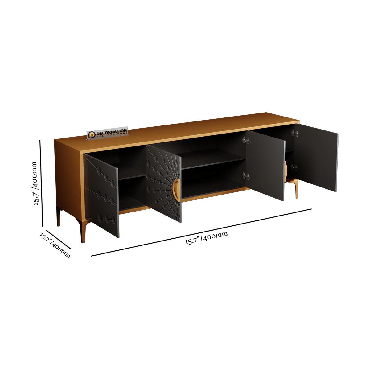 Elevate your living room with the timeless luxury of the Alven Art Deco TV Stand, a perfect blend of sophistication and functionality. Featuring a stunning grey finish accented with golden detailing, this TV unit embodies the glamour of Art Deco design. With four spacious doors and six internal shelves, it offers generous storage for your media devices, accessories, and décor items while keeping your space neat and stylish.