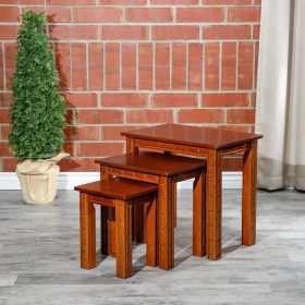 - The three tables nest beautifully or can be used separately. They are functional as well as beautiful by providing a lot of table space without taking up a lot of room. The medium and small table stack completely under the large table or can be staggered to add extra display space. They are perfect for any room..