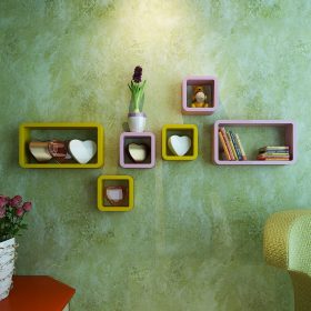 Wall Shelf Rack Set Of 6 Floating Cube Rectangle Storage Wall Rack By DecorNation – Pink & Yellow