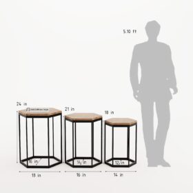 Introducing the DecorNation Hexagon Shape Harmony Nesting Trio Tables, a stunning set of three tables designed to bring style and functionality to any living space. These tables feature rich wood tabletops and solid metal legs, creating a perfect harmony of natural and industrial elements. The hexagon shape adds a modern and unique touch to your home decor, making these nesting tables a standout piece in any room. With their versatile design, they can be used as a set or individually placed throughout your living room, hall, bedroom, office, or even on your balcony. Crafted with attention to detail, the tabletops showcase the beauty of natural wood grains, providing a warm and inviting ambiance. The nesting design allows for convenient storage and space-saving solutions. When needed, simply separate them to create additional surface area for placing drinks, snacks, books, or decor items. These nesting tables are not only practical but also add a touch of sophistication to your home. Whether you have a contemporary or traditional style, the DecorNation Hexagon Shape Harmony Nesting Trio Tables effortlessly blend in with any interior design scheme.