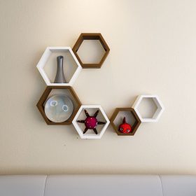 Wall Shelf Rack Set Of 6 Decorative Hexagon Wall Shelf Unit for Storage/Display- White & Brown