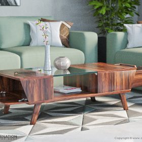 Putting a contemporary twist on mid-century modern styles, this coffee table’s mixed-media look is sure to grab glances! Founded atop splayed legs, it pairs a wood body with glass accents and a clean-lined silhouette. An open shelf below makes space to stage your favorite decorative pieces, while drop-down panels create a hidden storage compartment, allowing you to tuck away any living room essentials you want out of sight but close at hand.