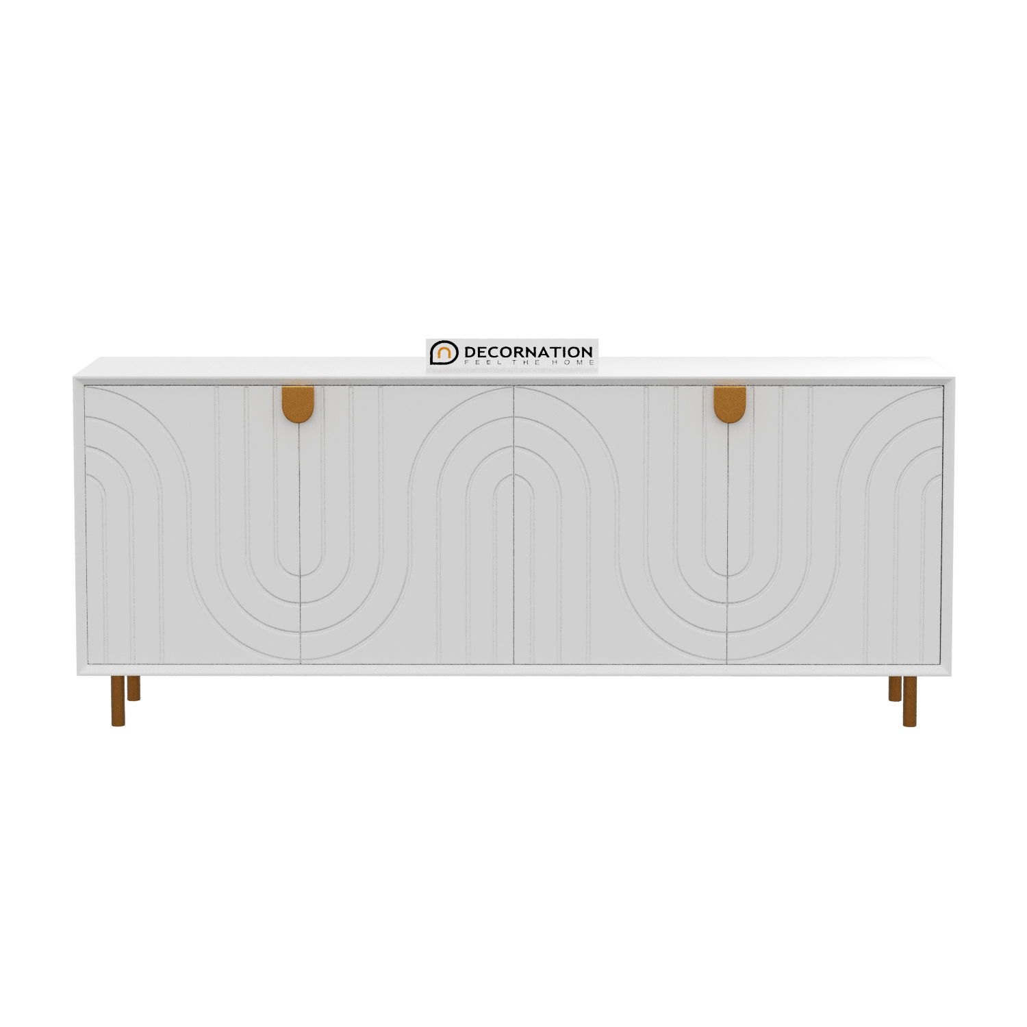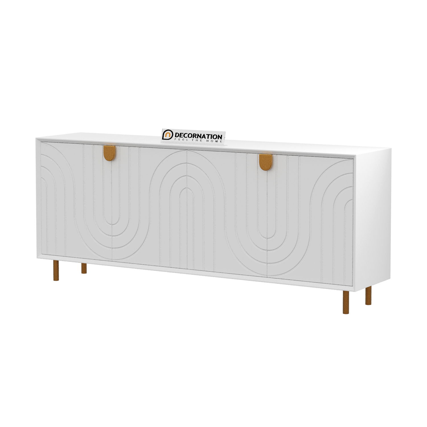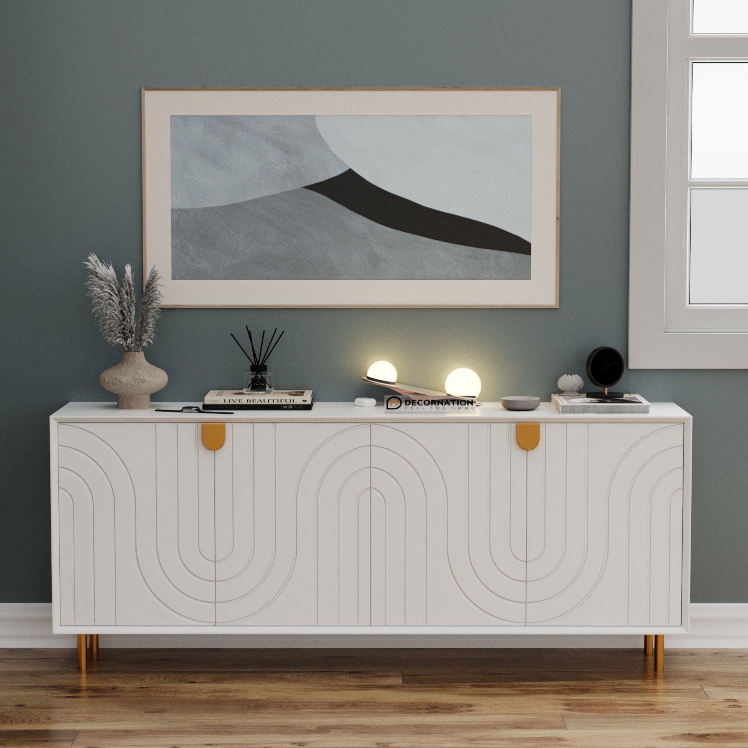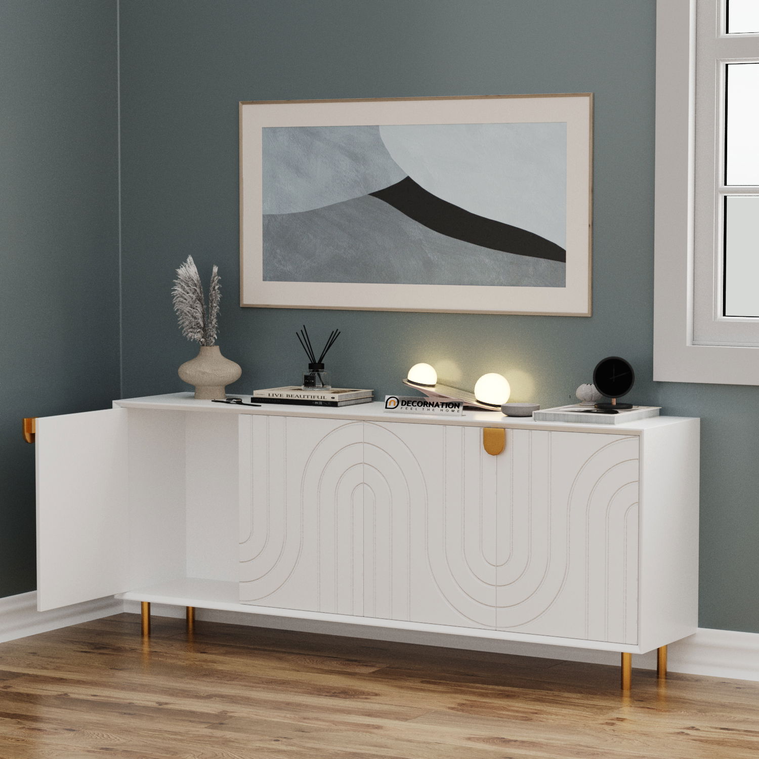 Bring a touch of luxury to your home with the White Wave Design Sideboard, a perfect blend of elegance and modern functionality. The cabinet features a stunning wave-textured front, complemented by sleek golden handles and matching gold legs that add a sophisticated charm to your dining or living space. Behind its spacious doors lies ample storage for tableware, linens, or décor items, helping you maintain an organized and clutter-free environment. Crafted from high-quality engineered wood, this sideboard combines durability with timeless style, making it a standout piece in any contemporary interior.