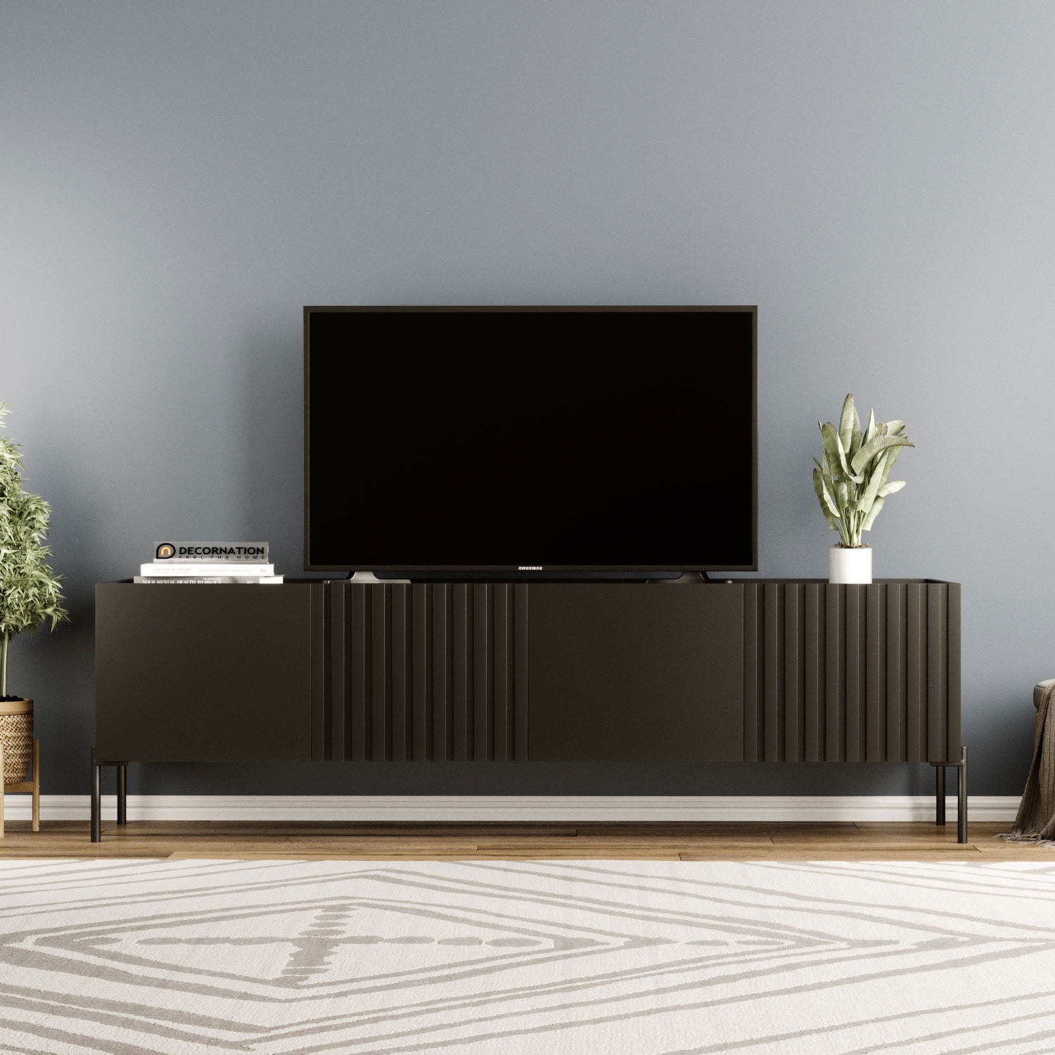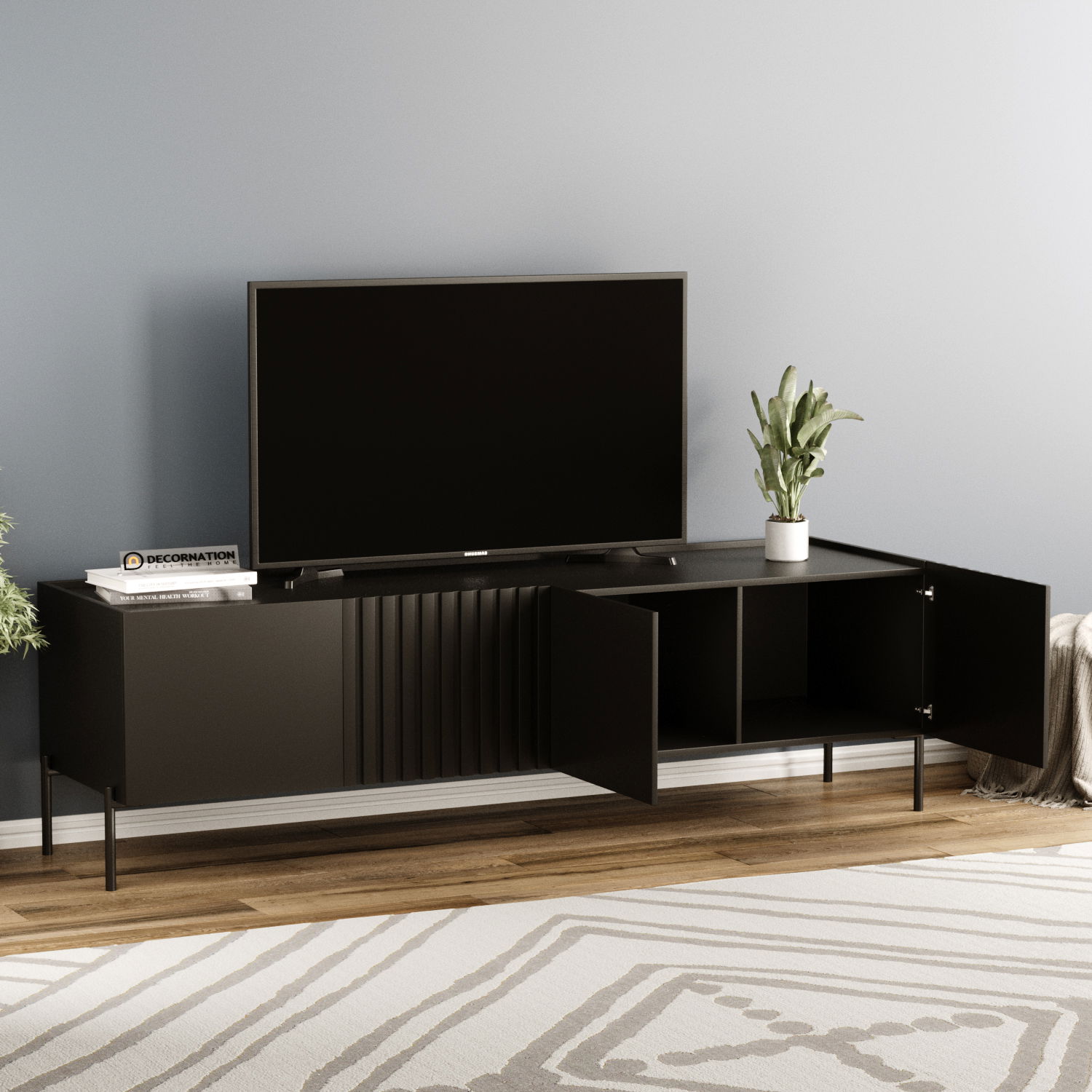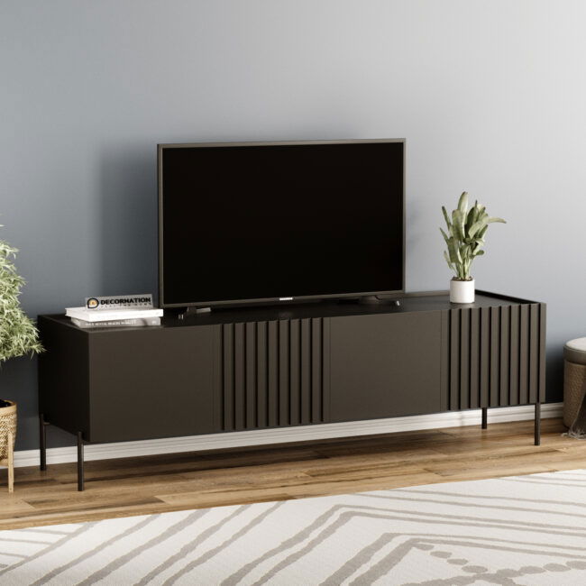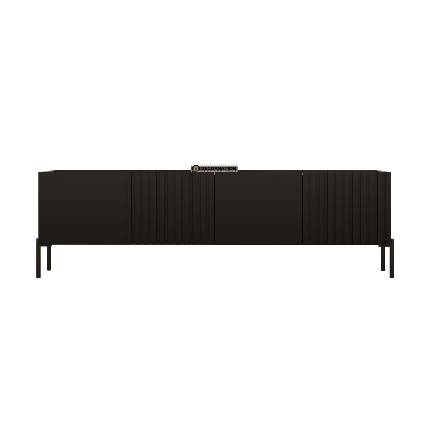 Add a touch of modern sophistication to your living room with this Black TV Unit featuring double-door shelves and sturdy metal legs. Designed for both style and function, this sleek entertainment unit provides ample storage space to keep your media essentials organized. The closed cabinets help you neatly store consoles, DVDs, and accessories, while the smooth tabletop comfortably accommodates your TV and décor. The matte black finish paired with industrial-inspired metal legs creates a contemporary look that complements any interior style.